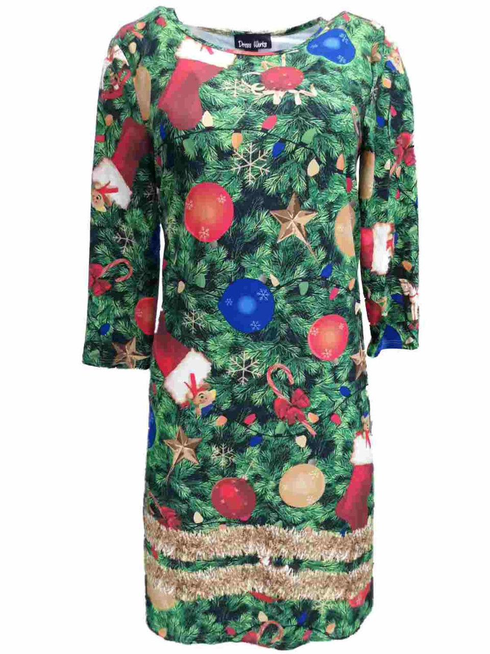 - Womens Green & Red Holiday Ornament Dress Christmas Tree Skater Dress