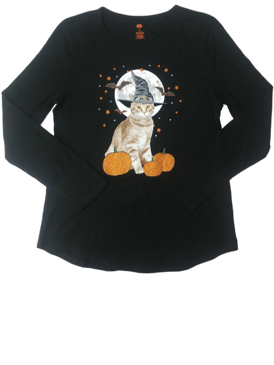 - Womens Happy Halloween Witch Kitty Cat Long Sleeve Tee Shirt Sparkly T-Shirt