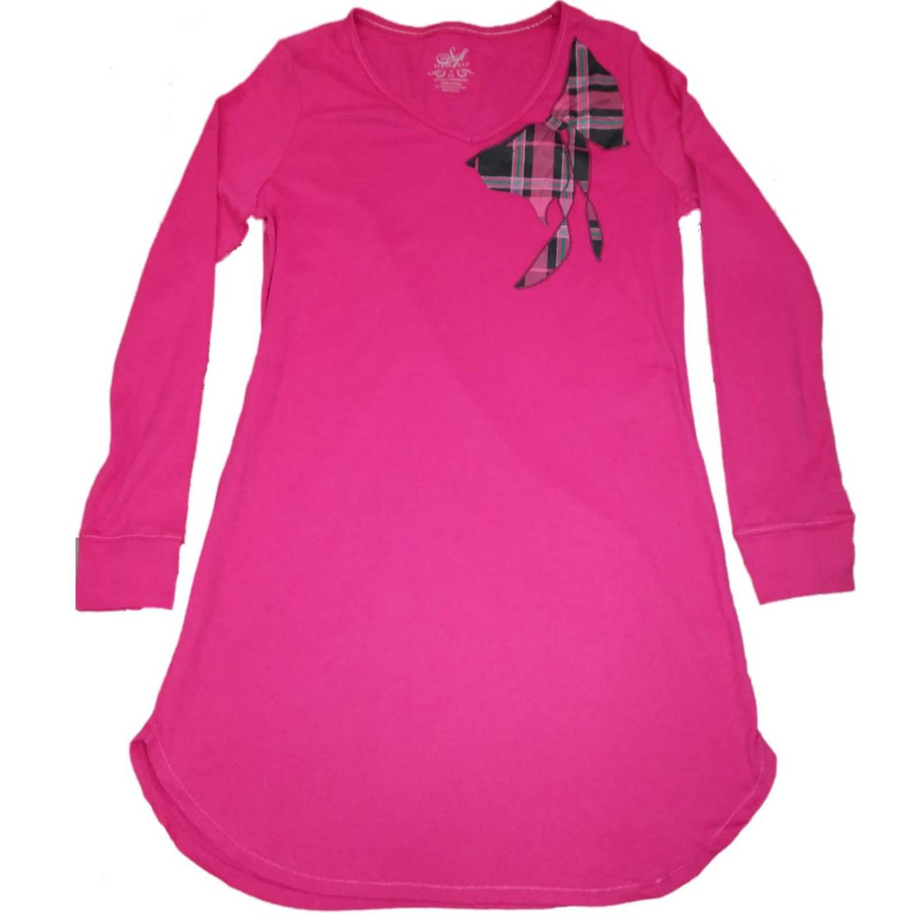 - Womens Hot Pink With Plaid Bow Long Sleeve Sleep Shirt Nightgown