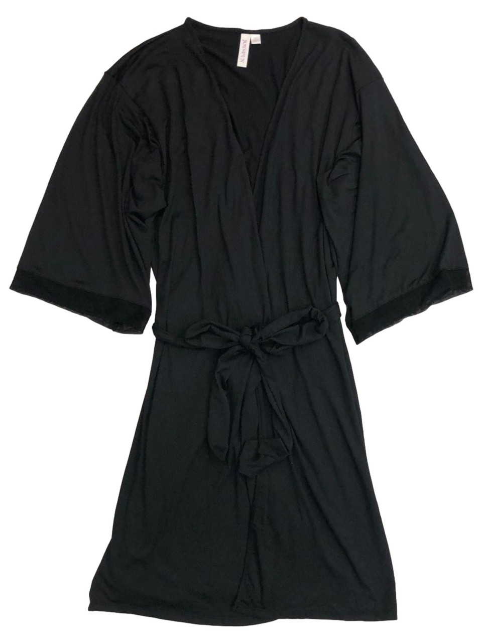 You will love the sleek cozy feel of this lightweight black bathrobe. It is perfect to wear out of the shower or to cover up your favorite nighty!