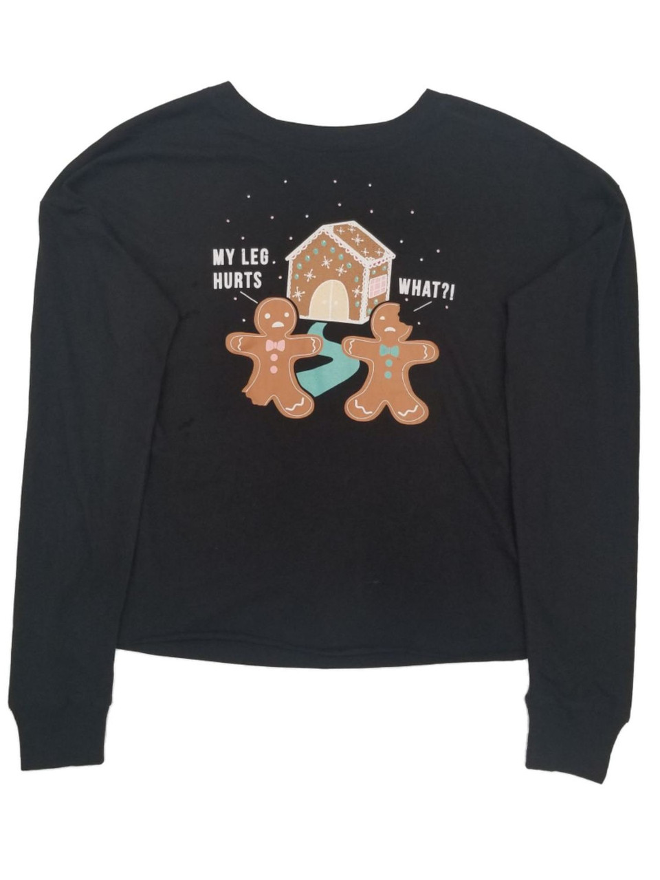 You will be all ready for the holidays in this fun long sleeved black " My leg hurts" funny gingerbread man themed tee shirt!