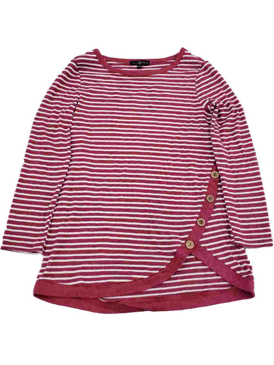 - Womens Mauve White Stripe Asymmetrical Button Hem Shirt Top Sweater