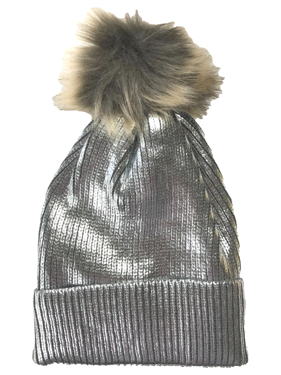 - Womens Metallic Silver Pom Beanie Cuffed Stocking Cap Hat