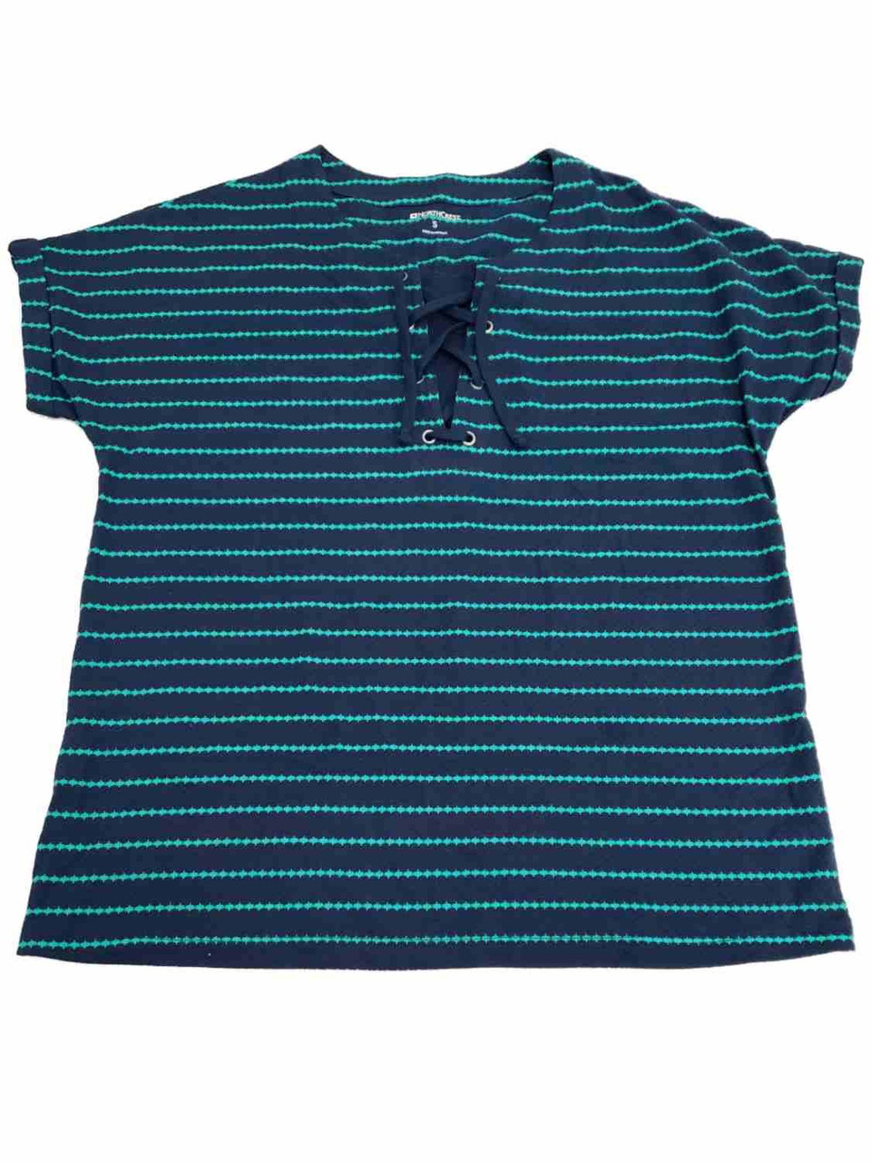 - Womens Navy Blue & Teal Striped Short Sleeve Lace Front Shirt Top T-shirt Small