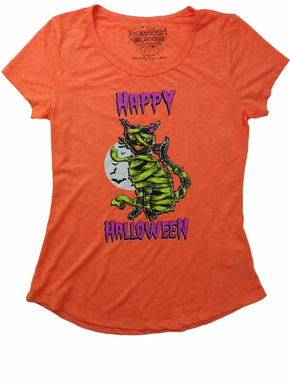 - Womens Neon Orange Mummy Kitty Cat Halloween Tee Shirt Moon Black Kitten T-Shirt