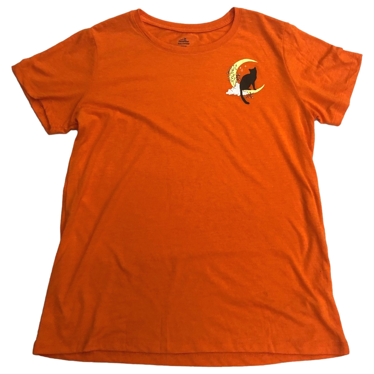 - Womens Orange Halloween Tee Shirt T-Shirt Black Cat & Moon