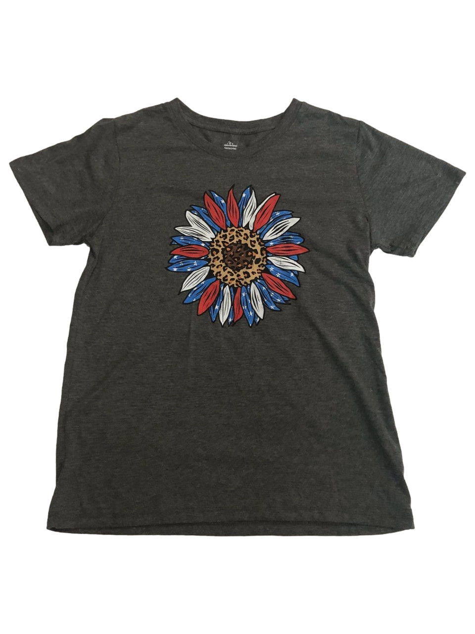 You will love wearing this pretty patriotic gray sunflower themed "red, white, & blue" tee shirt with your favorite pair of pants or shorts!