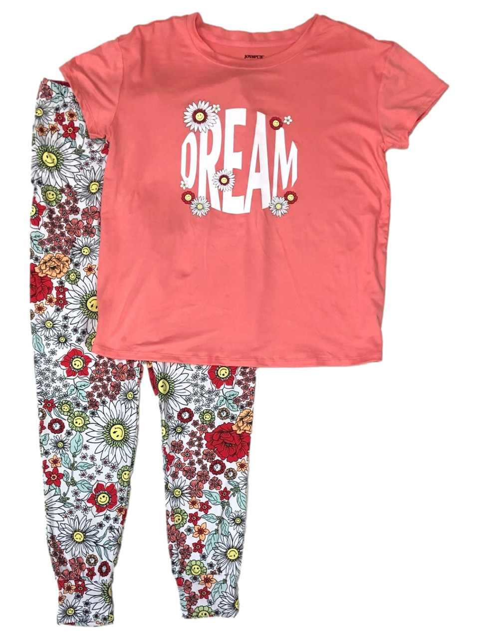 You will love the cozy lightweight feel of these fun peach colored paisley floral "Dream" themed pajamas. They are a silky tee shirt material and include a t-shirt top & elastic waist jogger style sleep pants with 2 side pockets.