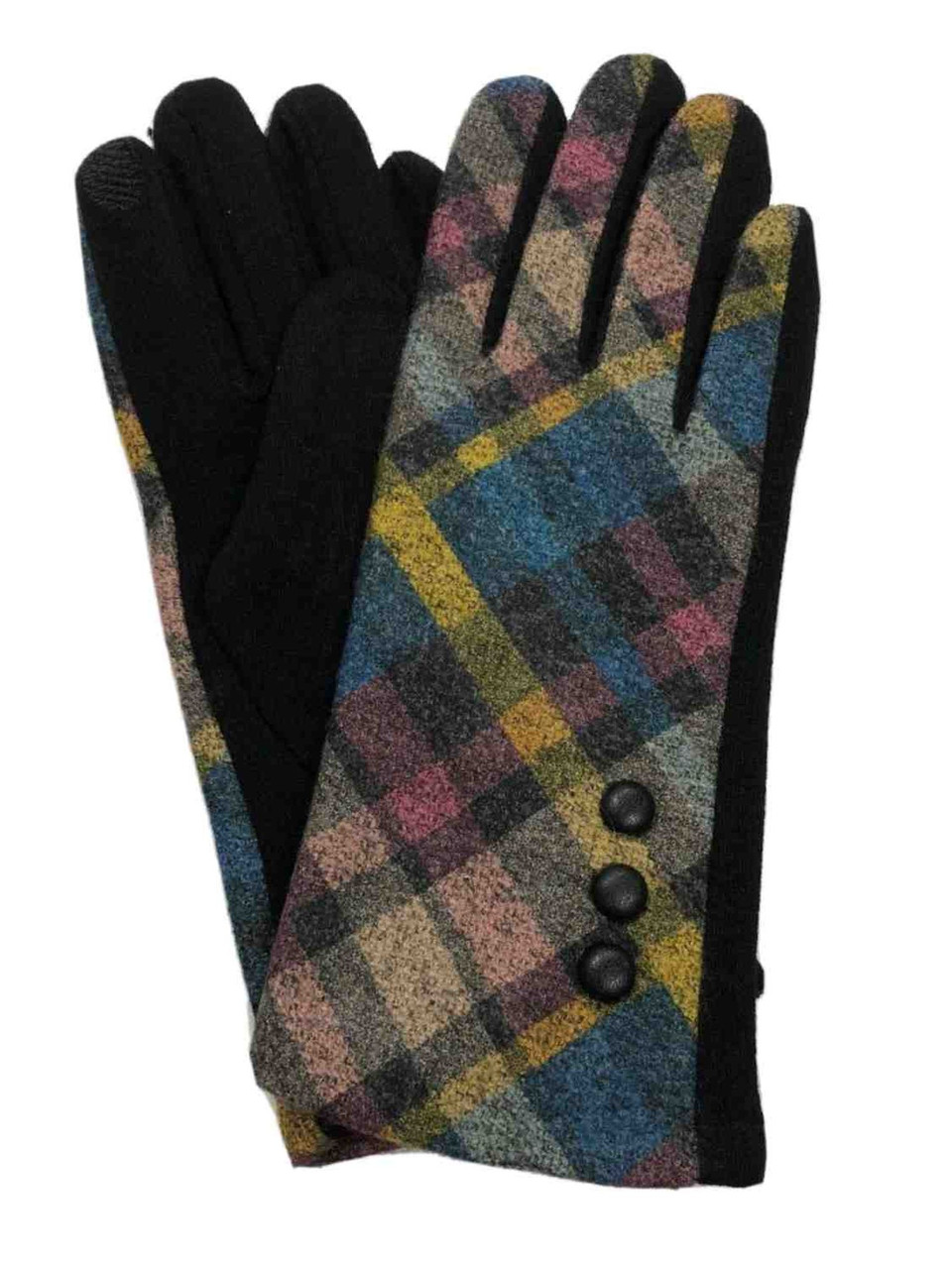 You will look great in these pretty brown, pink, blue, & yellow button trimmed plaid stretch fit texting gloves!