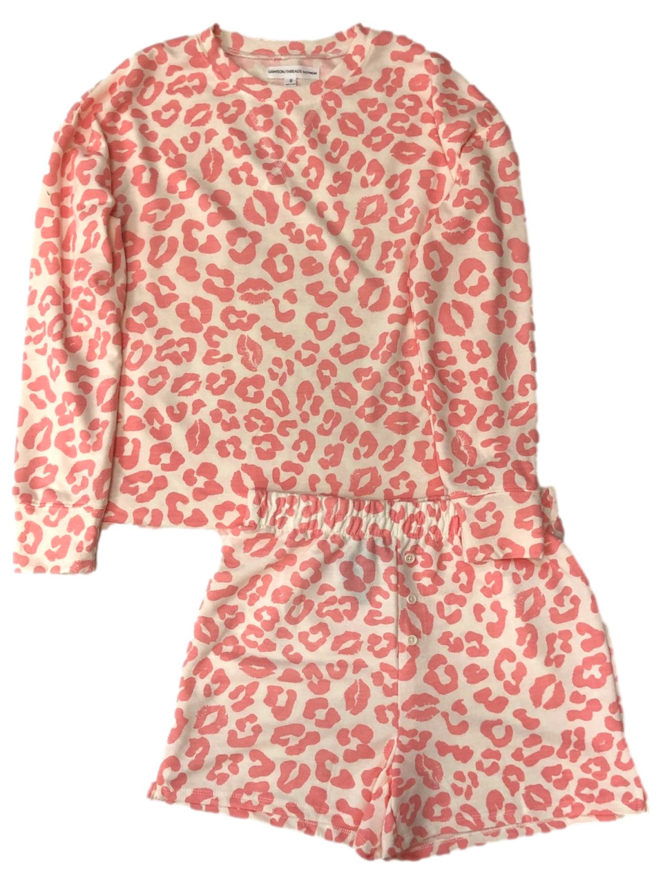 - Womens Pink Leopard Print Kiss Pajamas Long Sleeve Tee & Shorts Sleep Set
