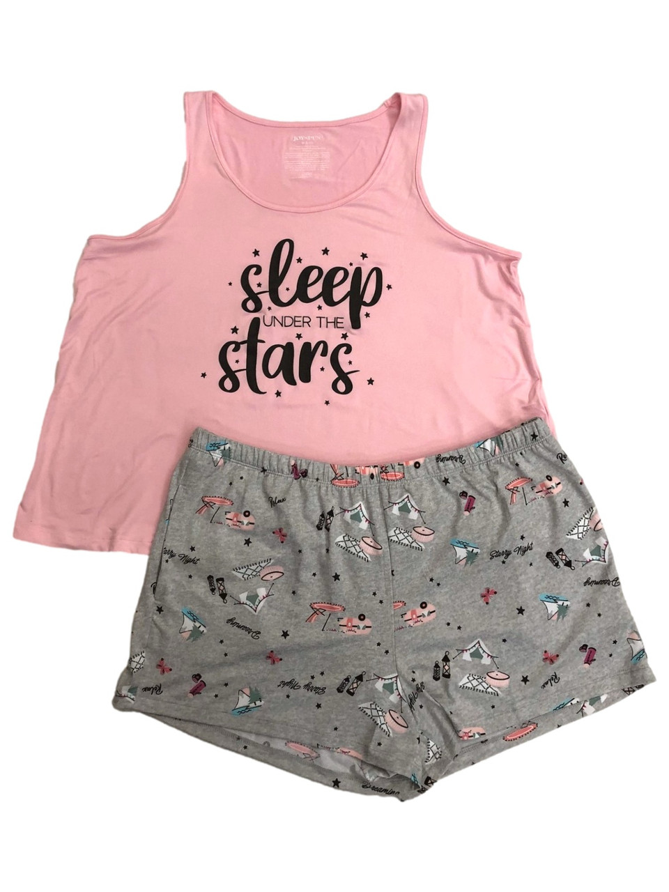 You will love the cozy lightweight feel of these fun pink & gray "Sleep under the stars" camping themed pajamas. They are a silky tee shirt material and include a tank top & elastic waist shorts with 2 side pockets.
