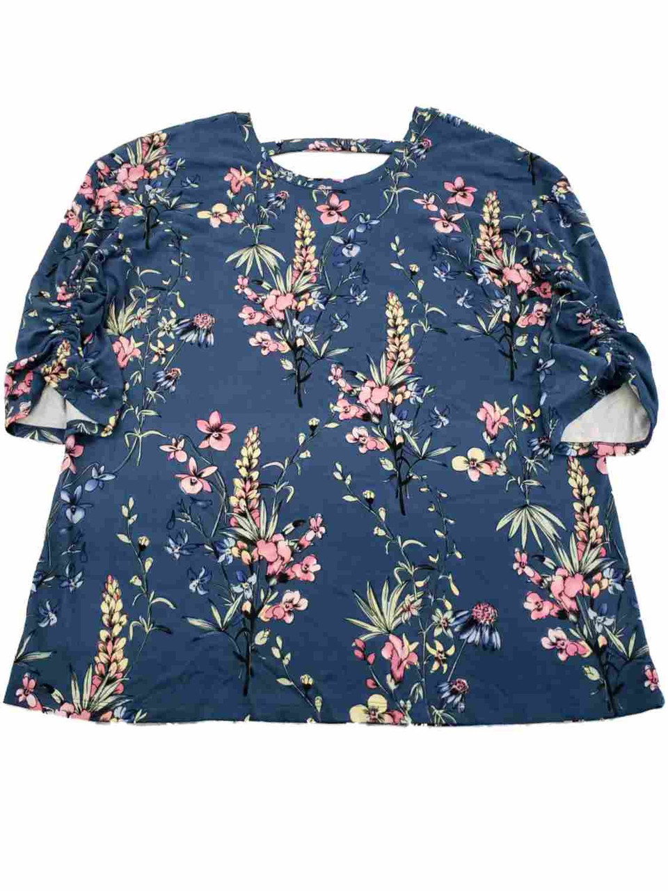 - Womens Plus Denim Blue Floral Soft Ruched Sleeve T-Shirt Tee Shirt Top 1X