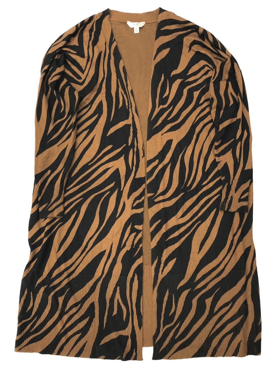 You will love wearing this pretty lightweight brown & black zebra print open front cardigan sweater with your favorite pair of pants. It is really soft and is a little on the long size. This would fall just above the knee on an average height woman.