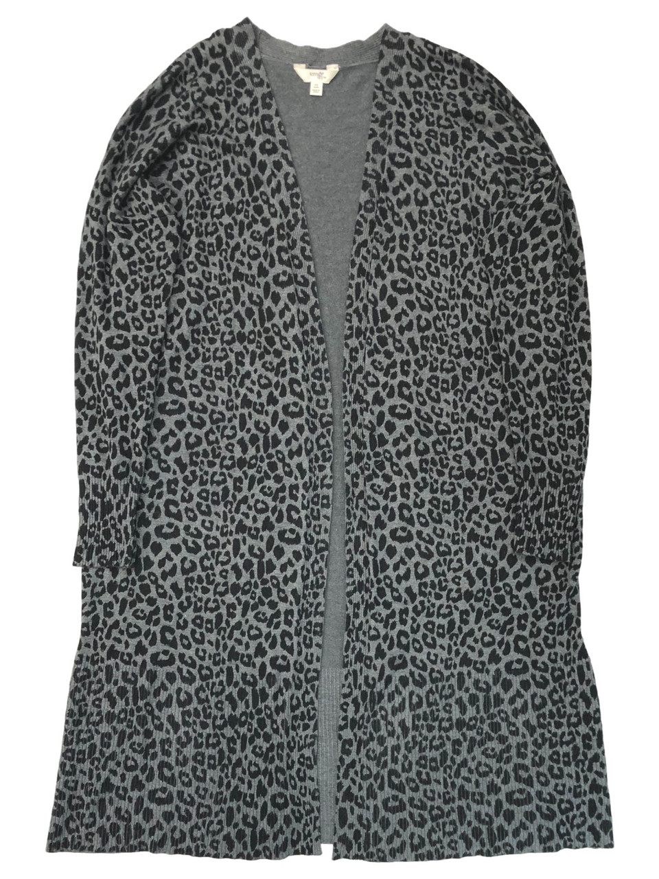 You will love wearing this pretty lightweight gray & black leopard print open front cardigan sweater with your favorite pair of pants. It is really soft and is a little on the long size. This would fall just above the knee on an average height woman.