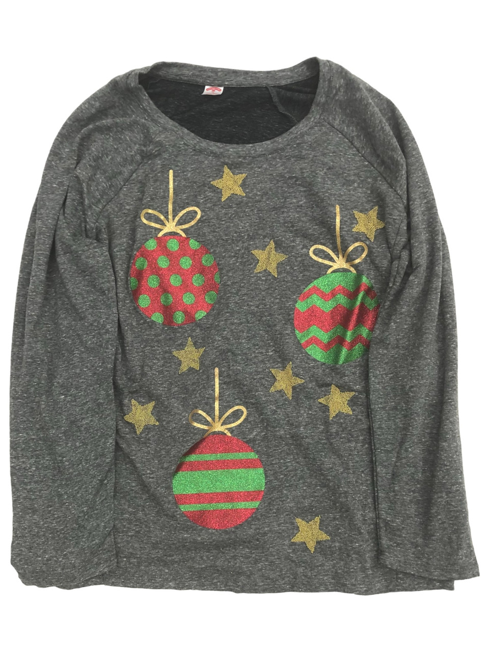 - Womens Plus Size Grey Glitter Ornaments Long Sleeve Christmas Sweatshirt Top