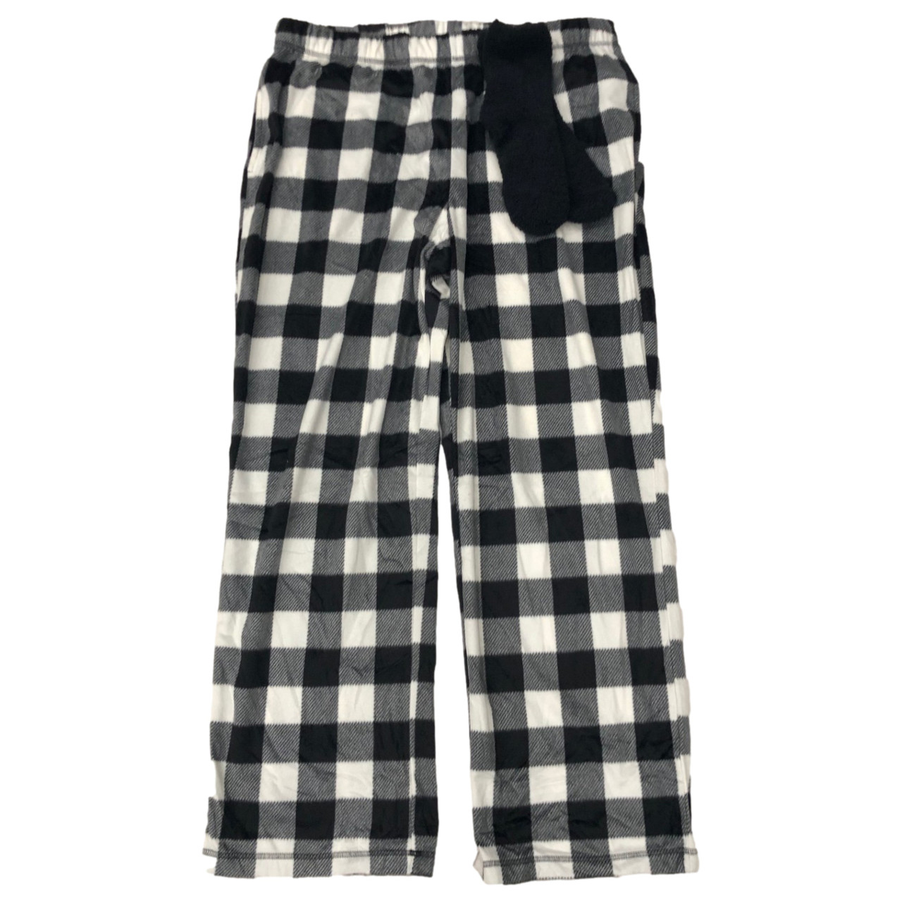You will love the cozy soft feel of these super soft black & white bufffalo plaid elastic waist pajama bottoms with side pockets. They even come with a bonus pair of fuzzy black socks!