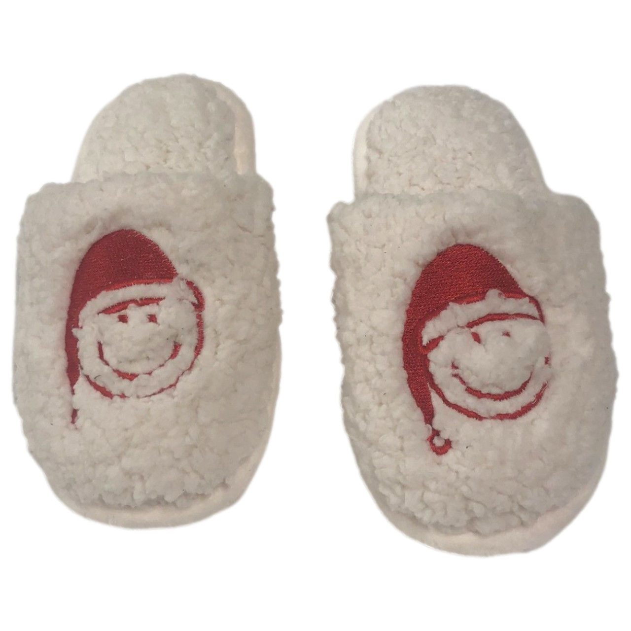 You will love wearing super cozy plush off-white sherpa "Santa Claus" Christmas themed holiday slippers around the house!