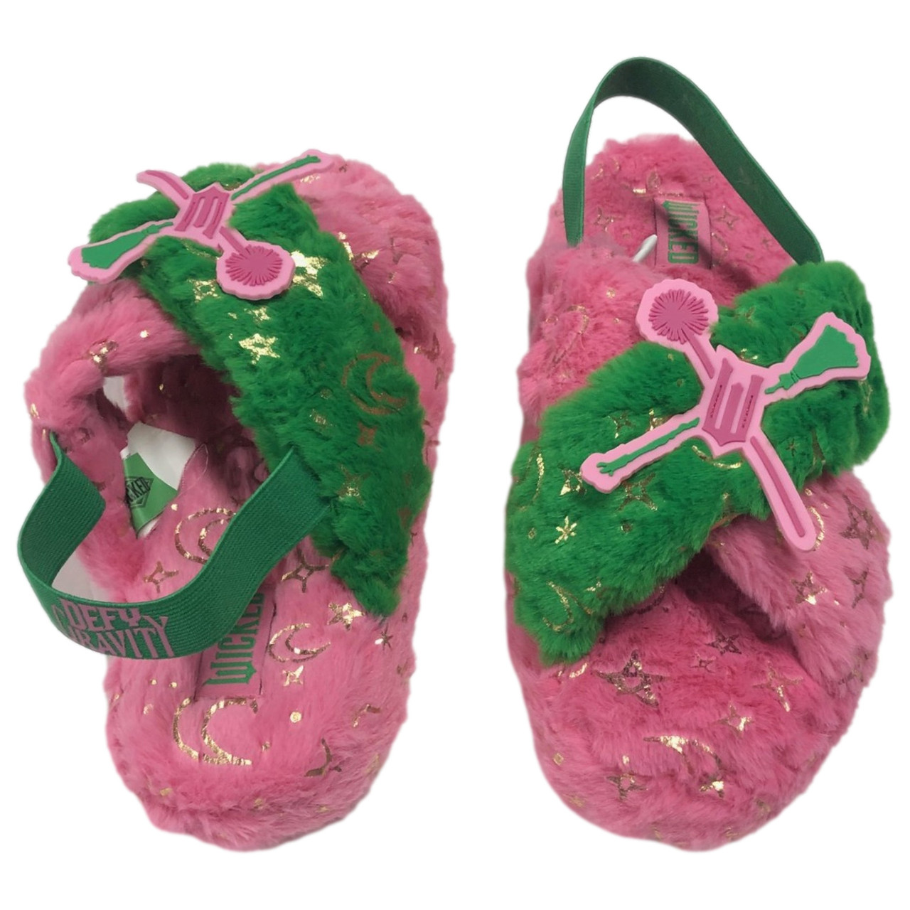 You will love wearing these cozy plush pink & green "Wicked" themed scuff style themed slippers around the house!