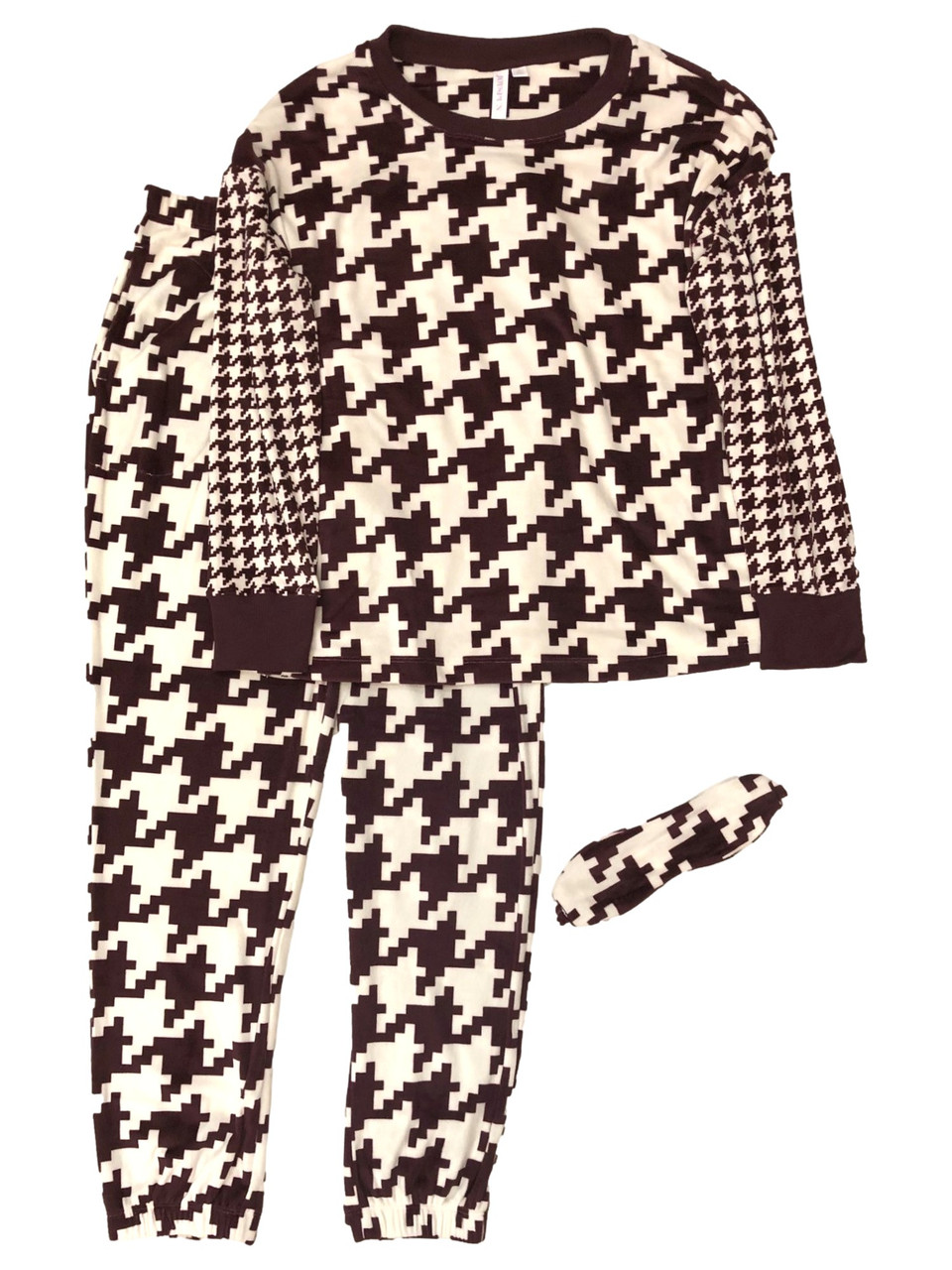 - Womens Purple Fleece Houndstooth Check 3pc Pajamas Joggers Top Sleep Set