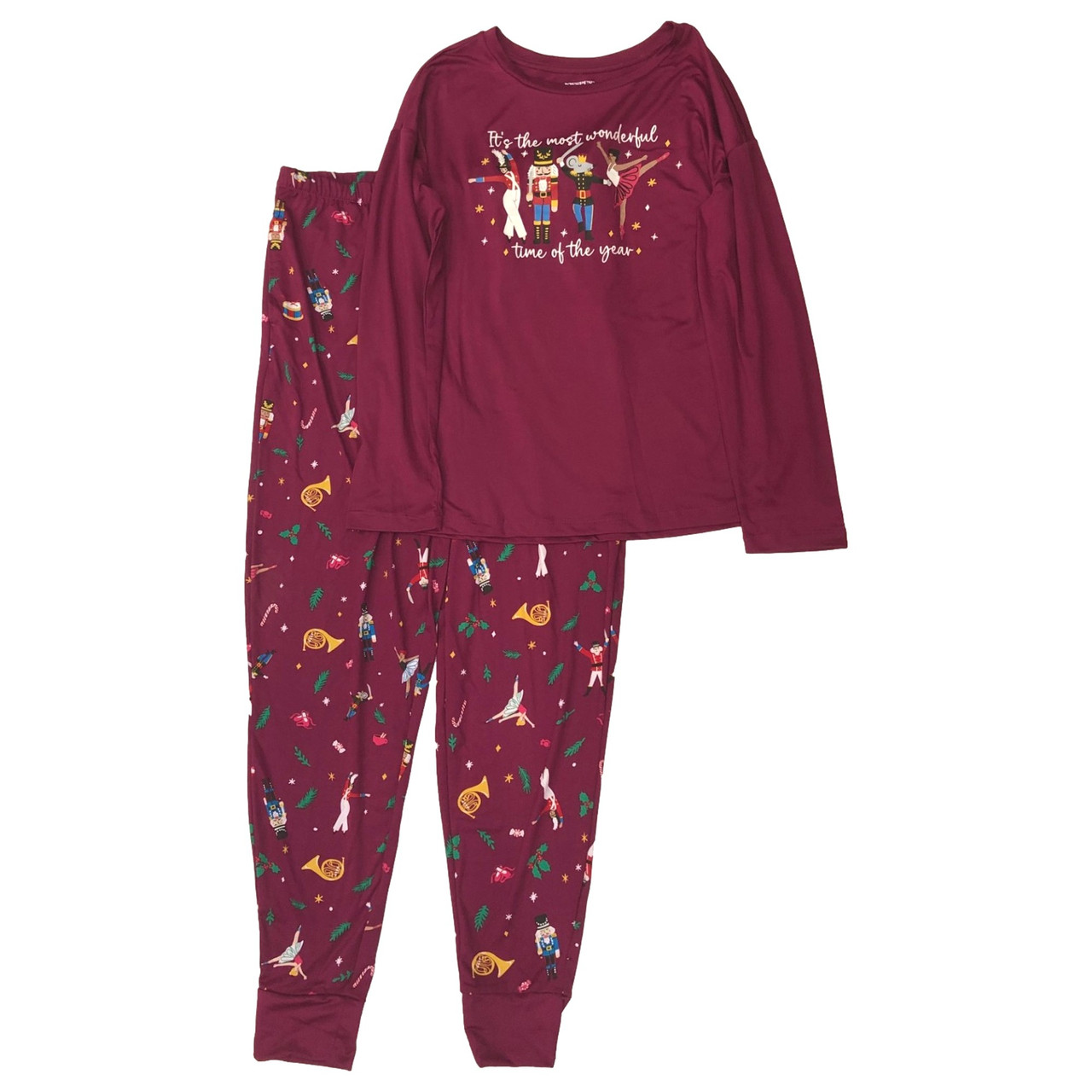 You will love wearing these super cute purple "Most wonderful time of the year" nutcracker, ballerina, & Christmas mouse themed pajamas to bed! They include a long sleeved sleep shirt & elastic waist jogger style pajama bottoms with pockets.