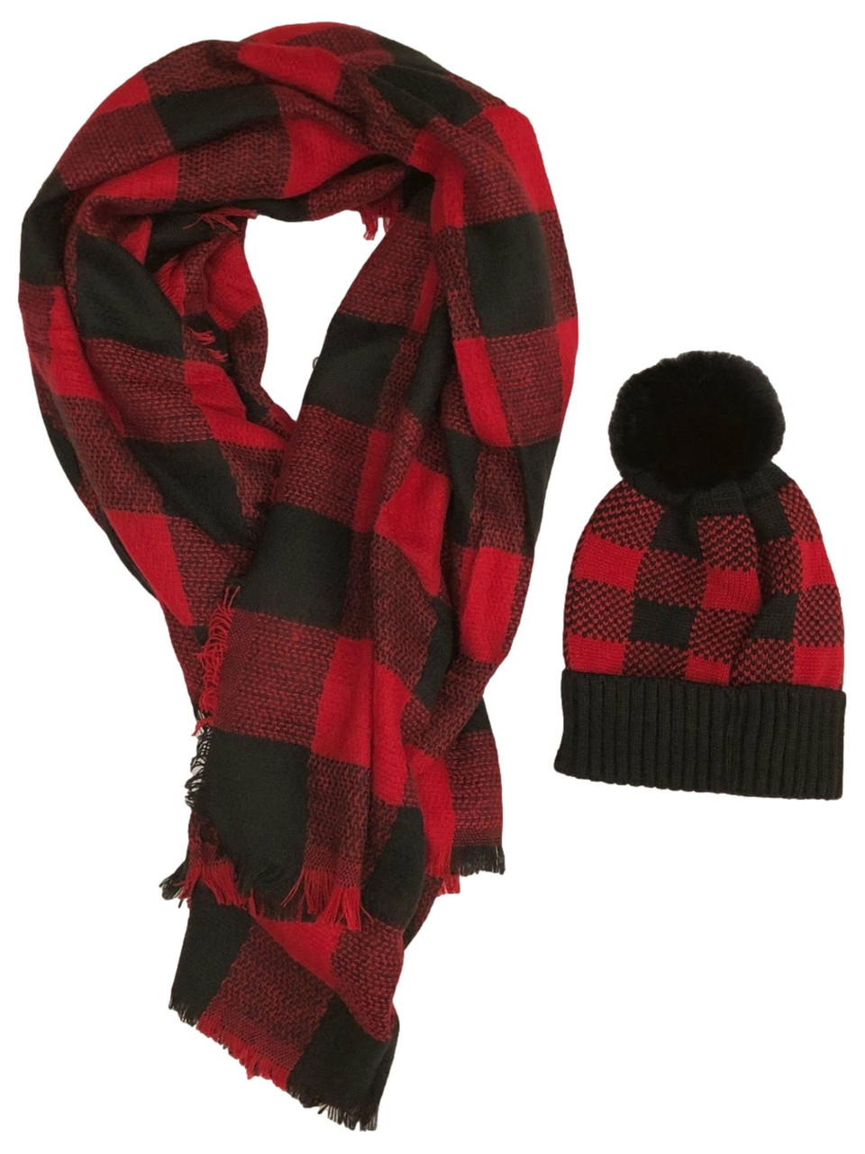 - Womens Red & Black Buffalo Plaid Pom Beanie Hat & Soft Blanket Scarf Set