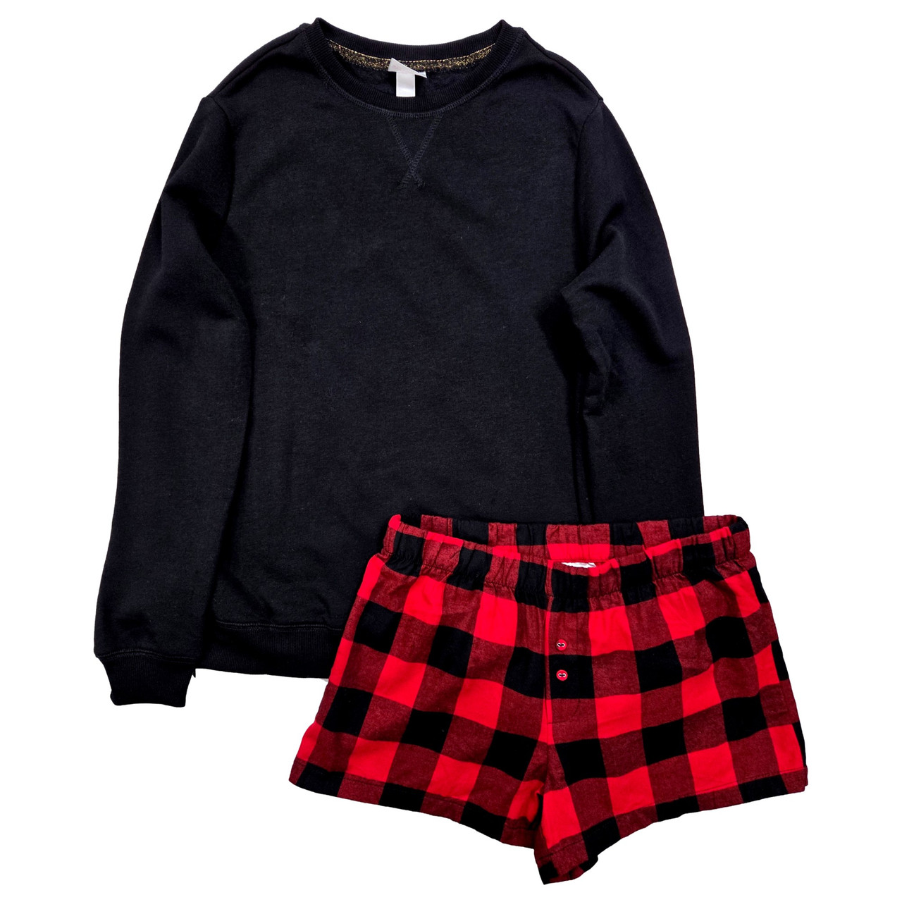 You will love wearing these super cozy red & black plaid flannel pajamas to bed! They include a long sleeved black sweatshirt top & elastic waist sleep shorts.