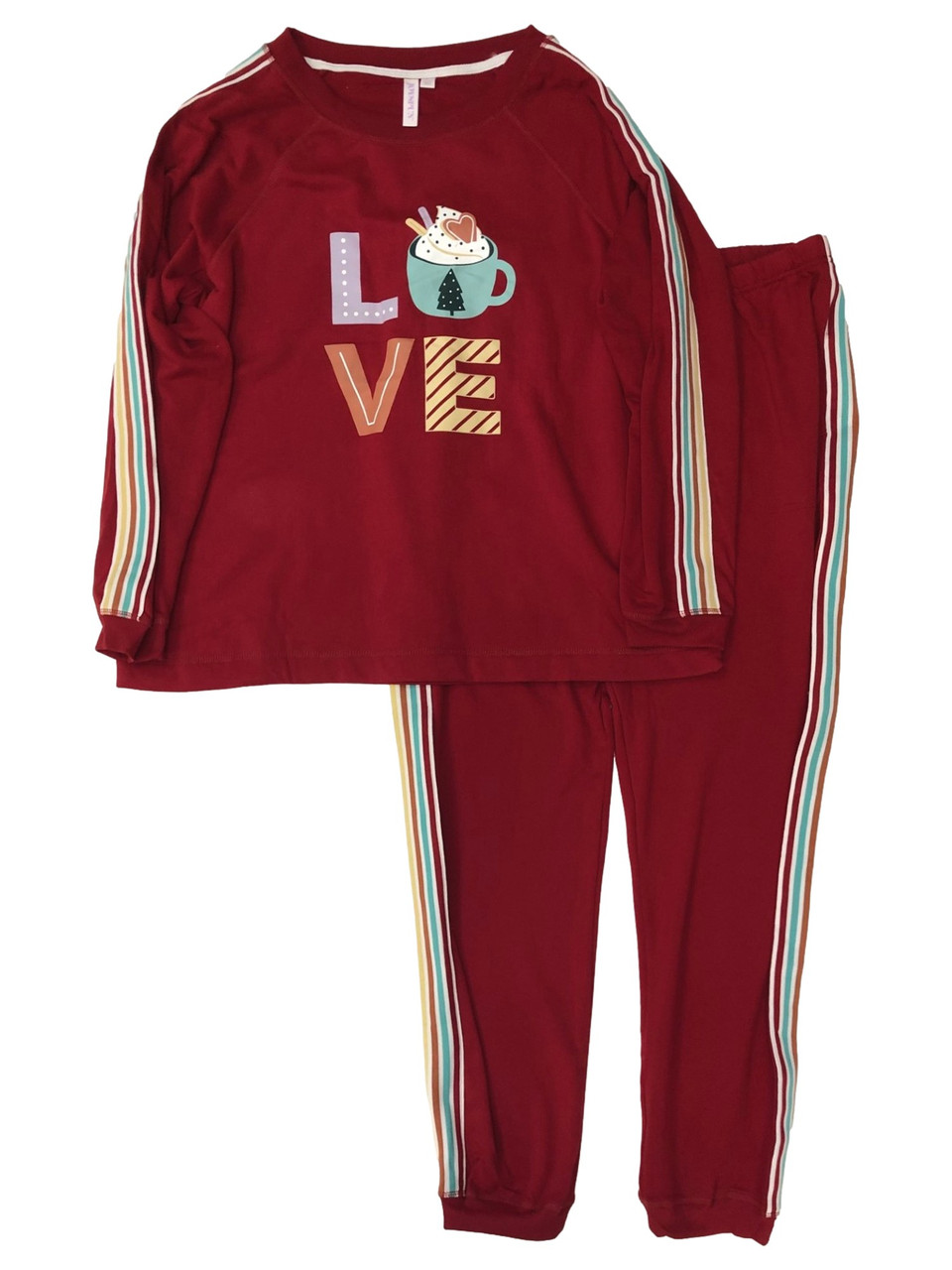 These adorable red cocoa "Love" themed holiday pajamas are so cozy & cute enough to be worn as a sweat suit! They include a pull-over sweatshirt style pajama top & jogger style sleep pants with with 2 side pockets.