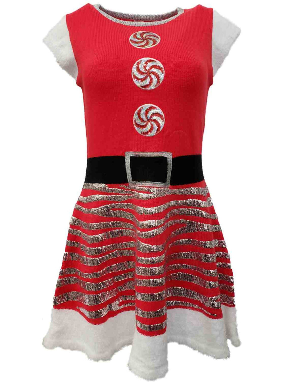 - Womens Red White Fuzzy Candy Sequins Christmas Holiday Knit Sweater Dress