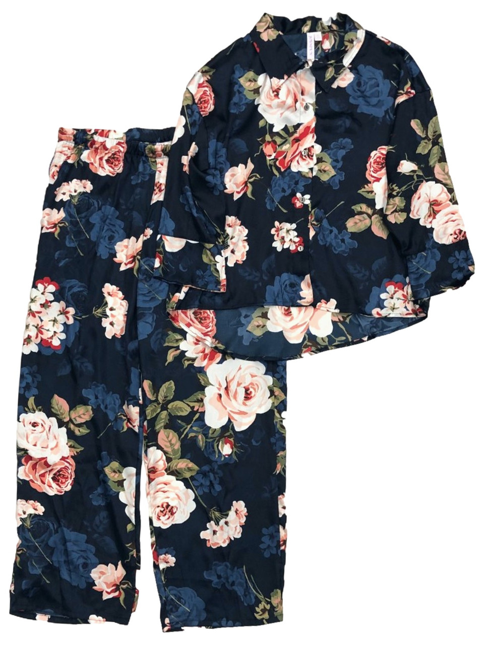 - Womens Silky Blue & Pink Floral Rose Print Button Front Pajamas Sleep Set