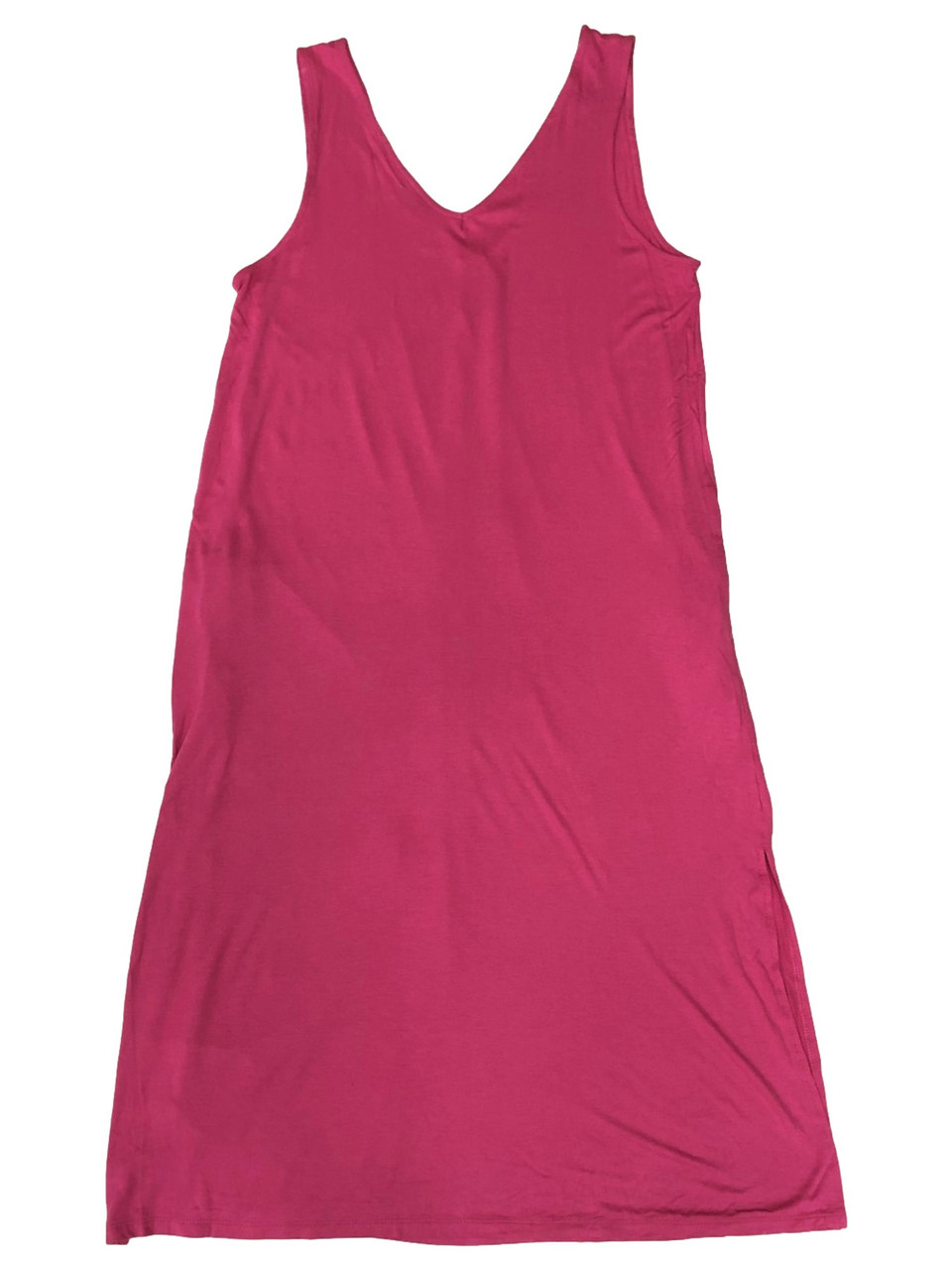 You will love the lightweight feel of this pretty hot pink t-shirt feel v-neck sleeveless nightgown with 2 side pockets!