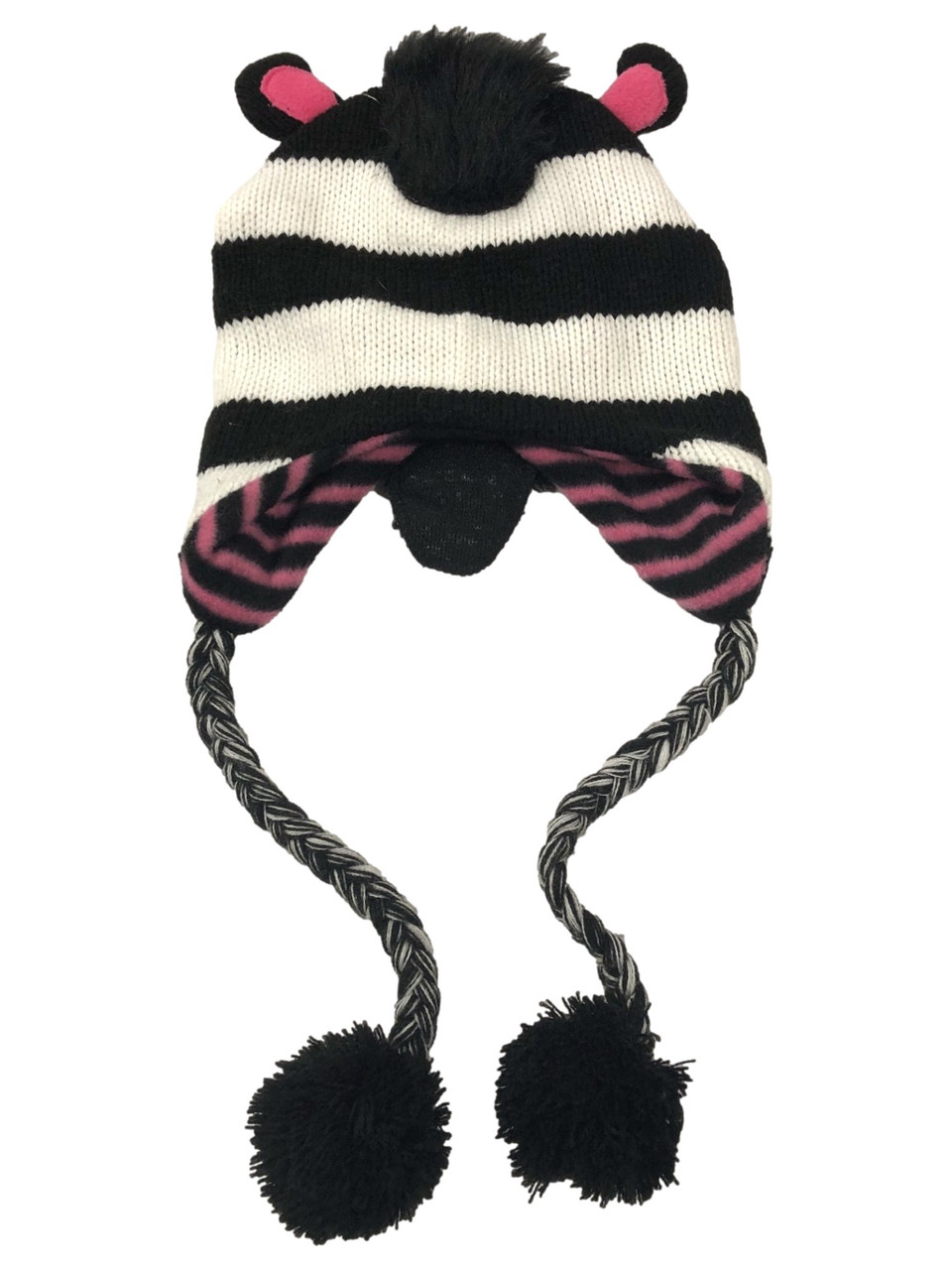 This cute black & white striped zebra themed trapper hat has covered ears, braided chin straps, and a warm fleece lining.