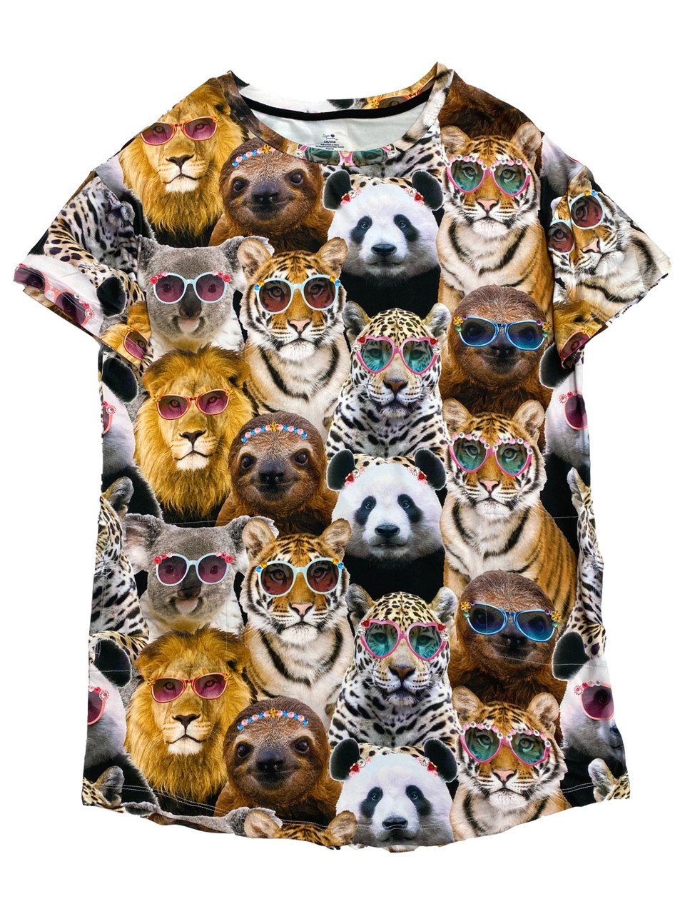 You will want to wear this adorable tan lions, tiger, sloth, & panda bear themed sleep shirt often!