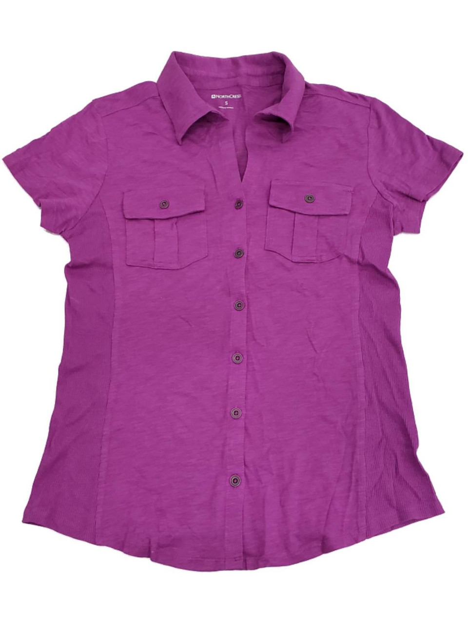 - Womens Violet Purple Button Front Casual Short Sleeve Tee Shirt Top Small