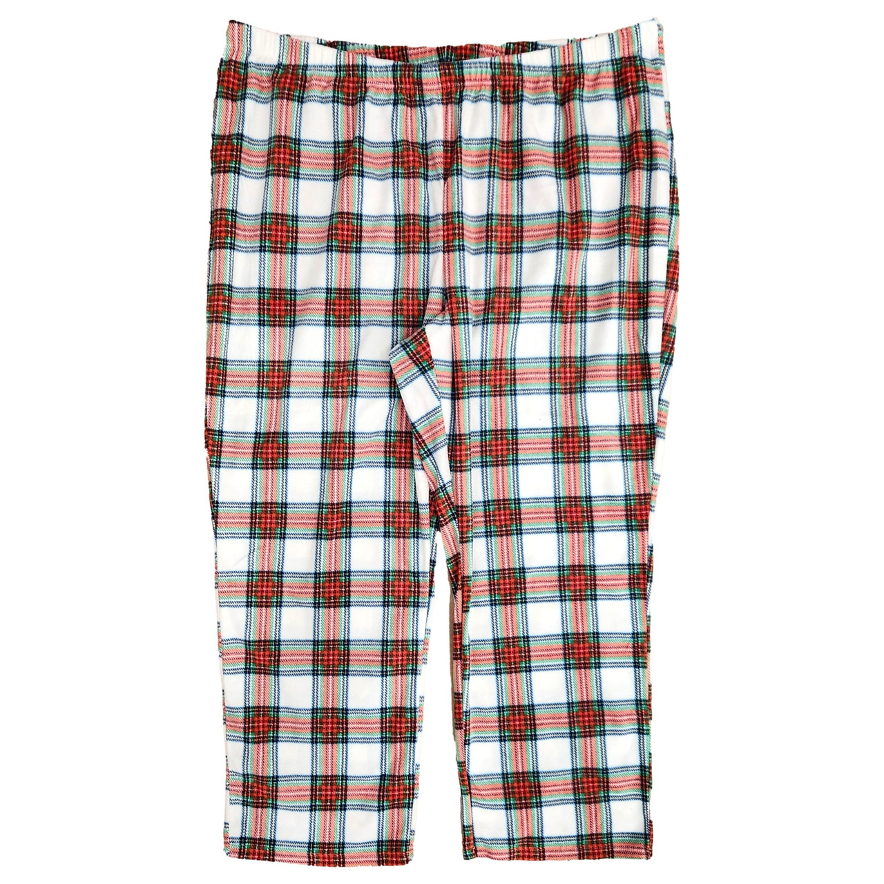 You will love the cozy feel of these white with green and red plaid fleece elastic & drawstring waist jogger style pajama bottoms!