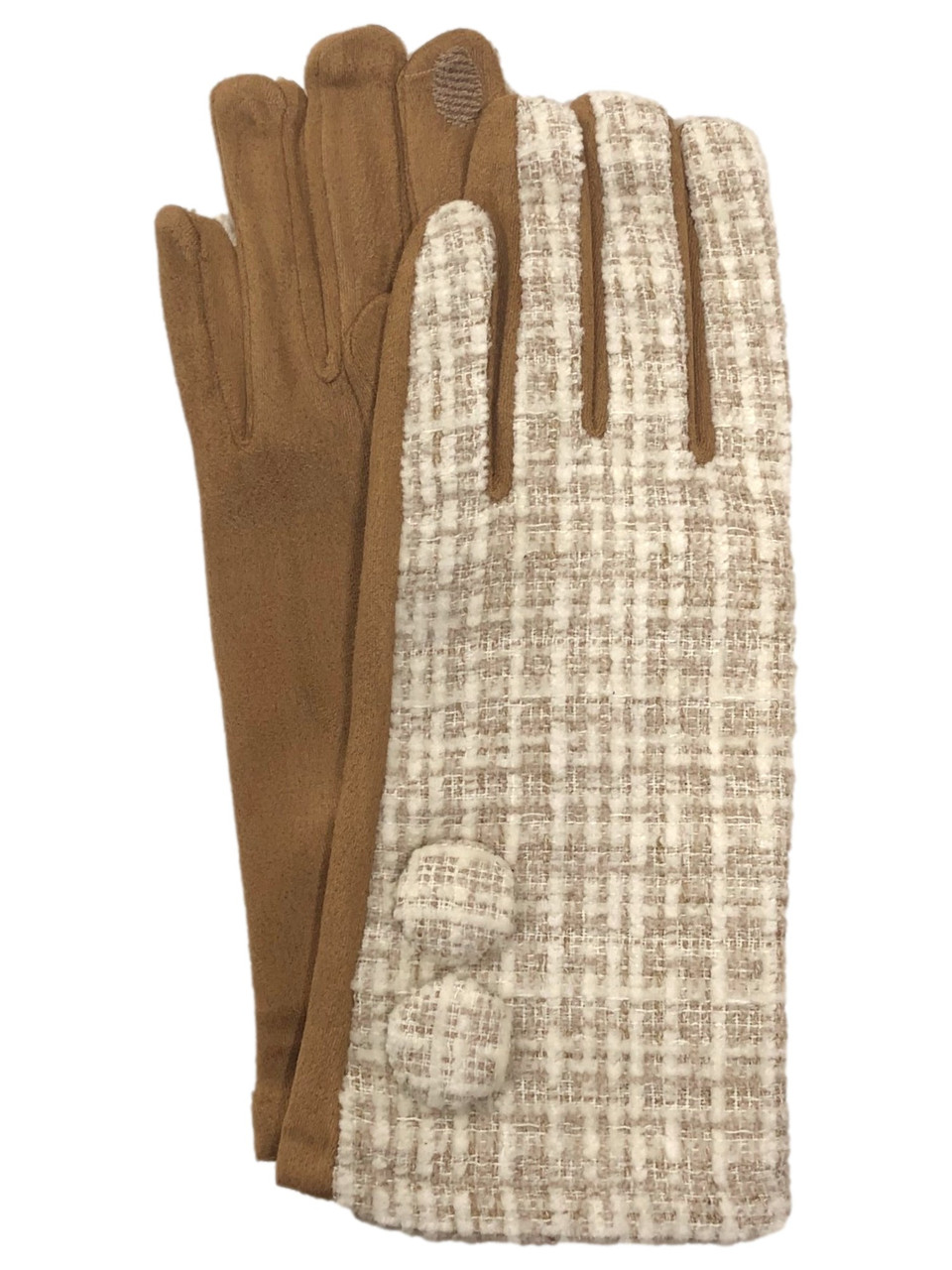 - Womens White & Tan Plaid Button Stretch Fit Texting & Tech Touchscreen Gloves