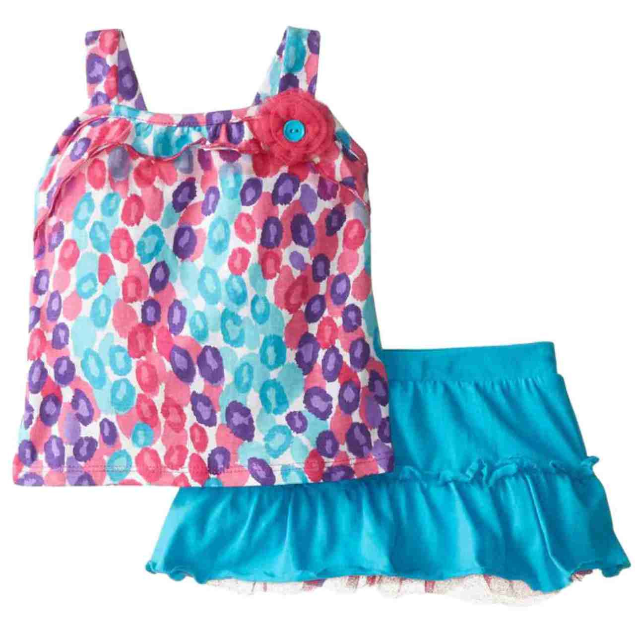This cute sleeveless top has multicolored animal print allover, ruffled tulle decorative accents, and coordinating turquoise blue scooter shorts with tulle ruffle. Perfect for summer play!