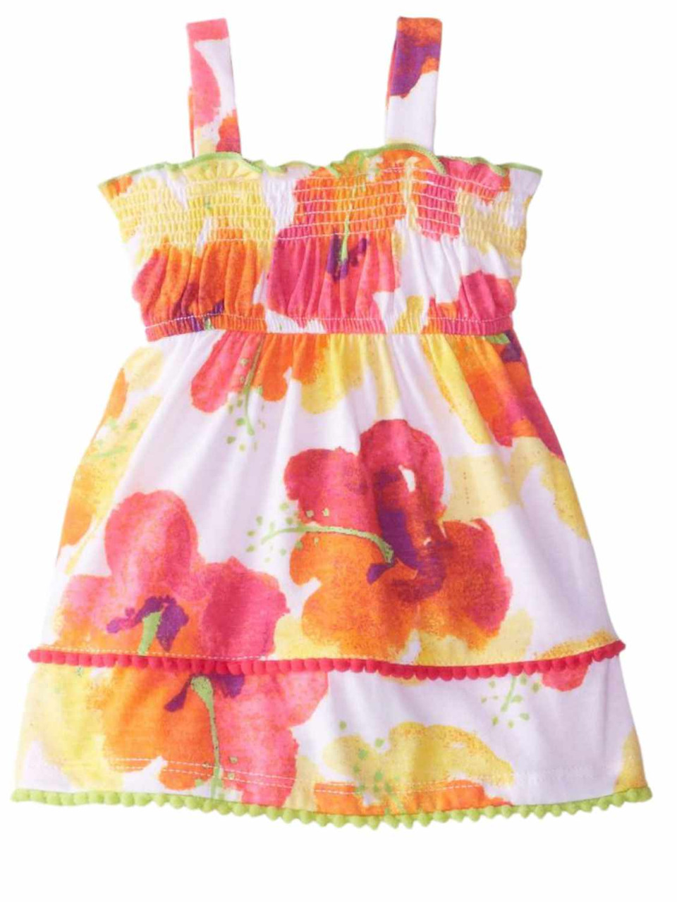 This bright floral sundress has a smocked upper bodice and tiny pom-pom ball trim around the bottom of the skirt. She will look adorable in this darling dress!