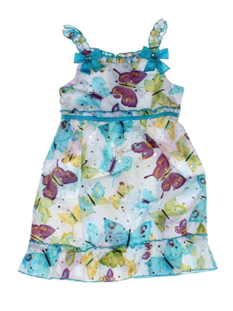 This adorable blue butterfly print sundress has ruffled shoulder straps and hem, and is embellished with silver sequins and bows with a blue rhinestone center.