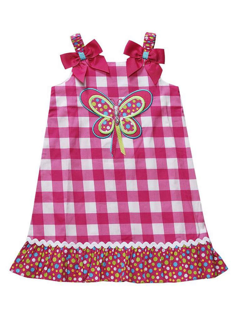 This darling sundress has a pink and white checkered print and is embellished with a large embroidered butterfly with rhinestones, polka dot ruffled hem, back button enclosure, and ribbon accents. Infant sizes come with matching diaper cover.