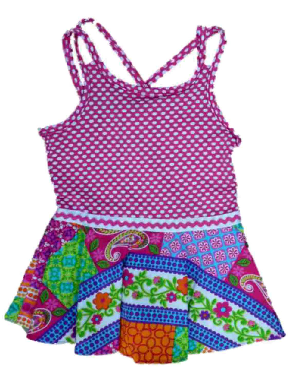 This cute sundress has pink with white polka dots on the upper bodice, spaghetti straps that crisscross in the back, and colorful paisley print on the skirt.