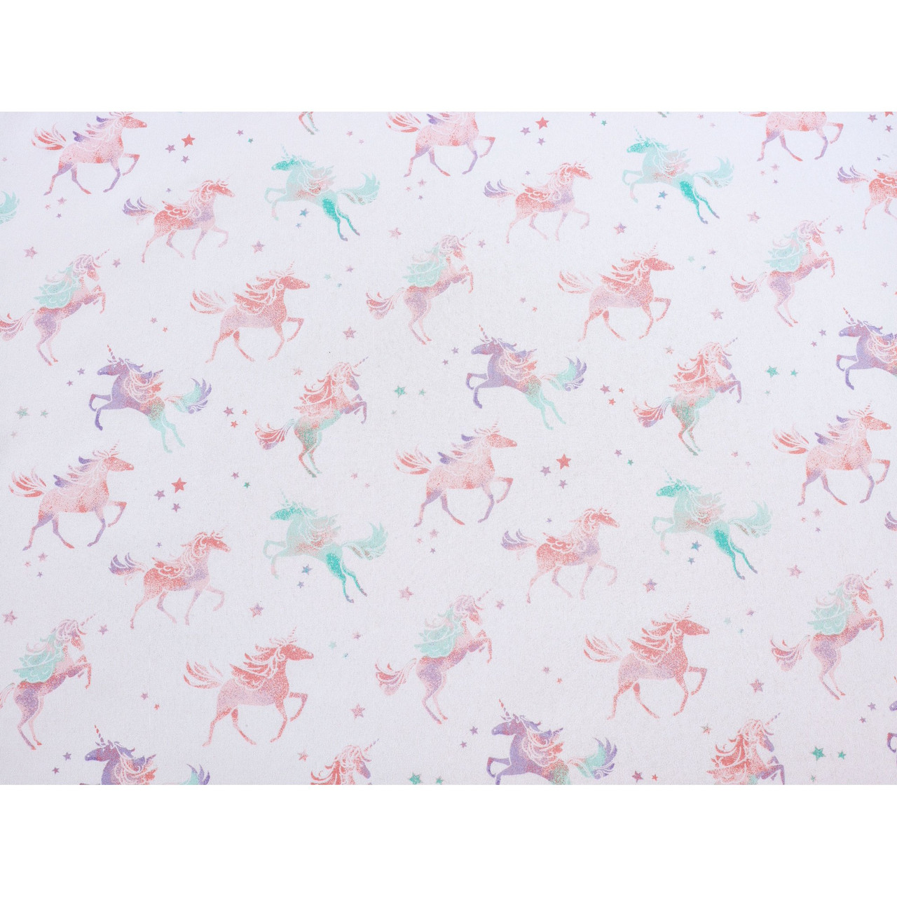 These pretty microfiber sheets will look great on any bed! They feature a darling pattern of rainbow unicorns and stars on a white background. The full set includes one flat sheet, one fitted sheet and two pillowcases. They are soft to the touch and wrinkle resistant. Will add a nice touch to your bedroom decor